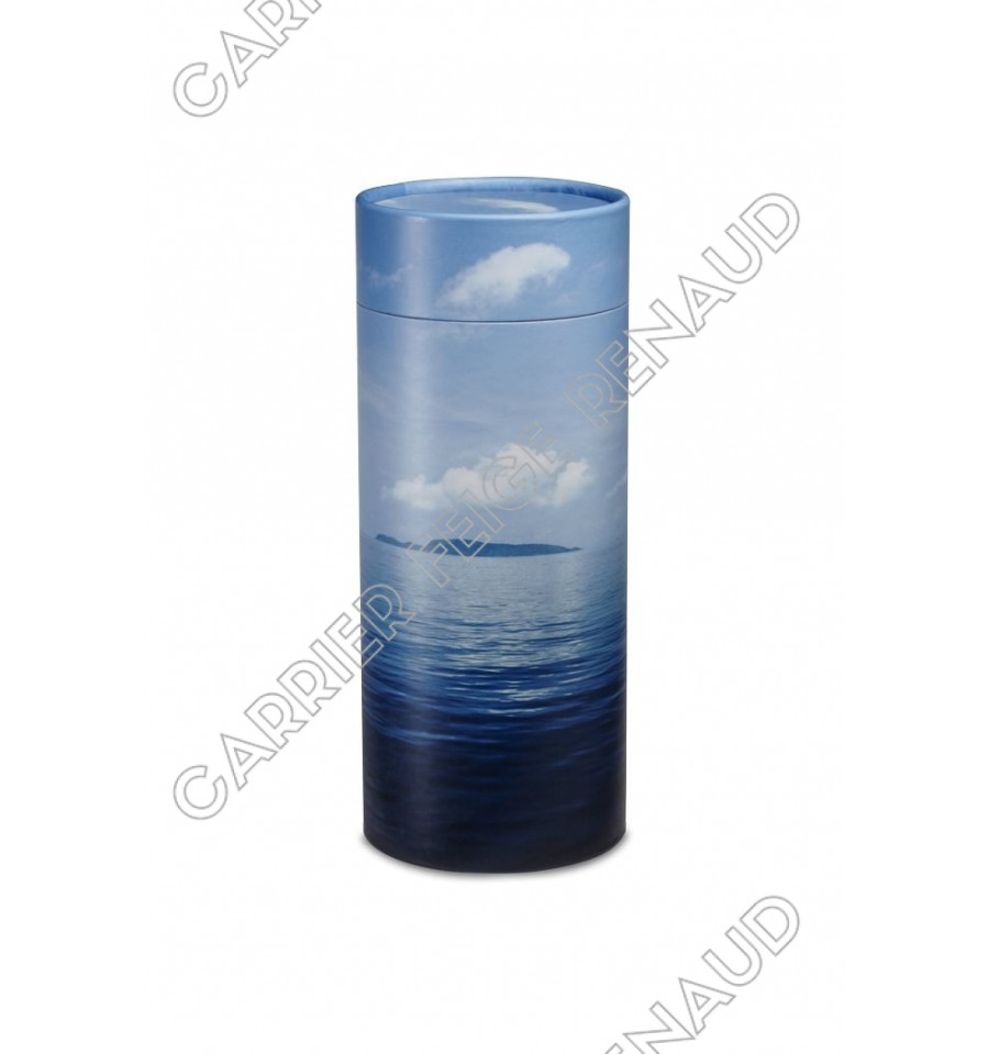 L'urne funéraire Zéphyr est une urne funéraire en carton disponible en couleurs et motifs Bougie, Colombe, Feuillage, Océan, Fleur de lotus.